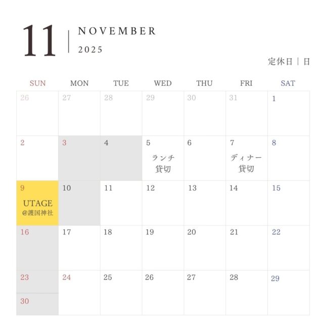 土曜・祝日ランチ/11:30~14:45(L.O 13:30)ディナー/18:00~21:30(L.O 20:30) 定休日:日曜